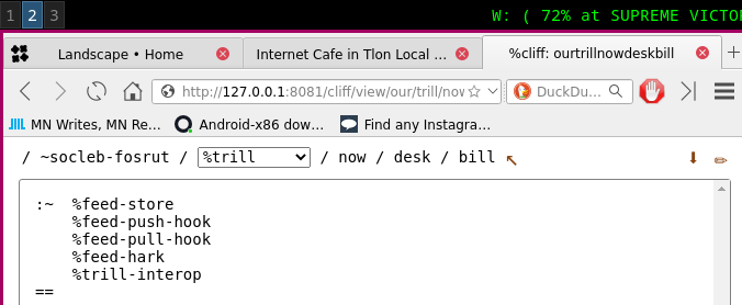 Cliff is another file browser, but this one actually lets you browse the Urbit filesystem. (You know, the contents of those .bin files Urbit stores everything in.) The top of the page has the file path. After the name of my Urbit planet is a drop-down list that let me see the data my apps had stored. Most apps just had a desk/bill... folder? file? I'm not sure what it was, because %cliff didn't make it obvious, but it didn't have anything interesting in it.